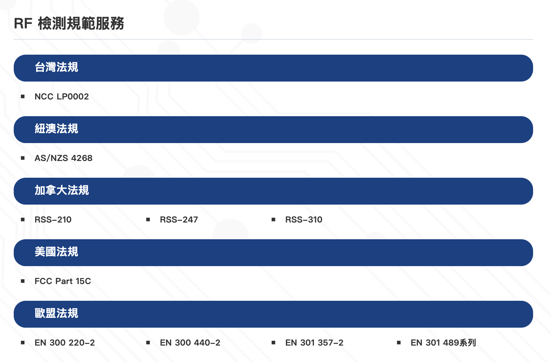 宇海科技股份有限公司為因應當前電子業的發展趨勢,並以滿足國內外電子業無線通訊產品檢測認證需求,於1999年依循 ISO 17025認證實驗室之品質系統標準規範成立無線(RF)認證測試服務部門,並取得台灣TAF 的認證資格 ,可執行美國 FCC、加拿大IC、歐盟CE、紐澳RCM/C-Tick及台灣NCC…等多國無線通訊產品專業的測試與服務。無線認證部門的成員係由資深的無線通訊工程師組成,以豐富的專業經驗協助電子產業及廠商快數取得認證進入市場。