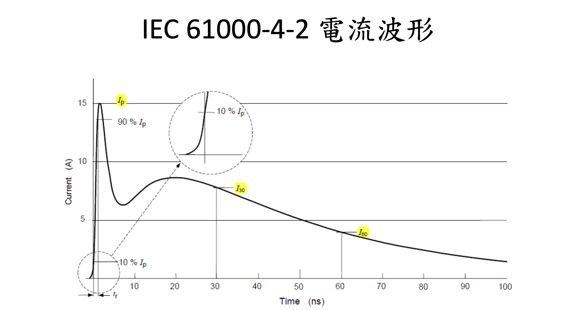 – ESD 電流波形: 上升時間700ps ~ 1ns 內須達到
